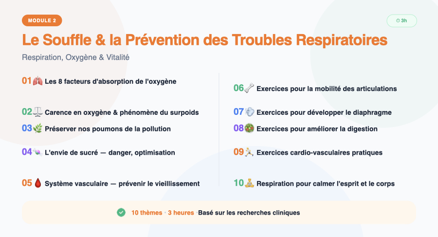 Ce module vous dévoile les 8 facteurs clés qui influencent l’oxygénation de votre corps et vous donne des exercices pratiques pour une santé durable. »