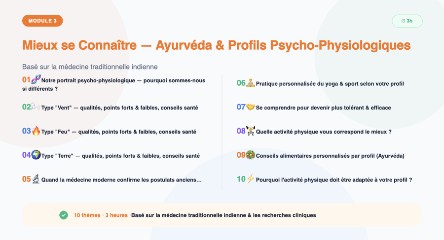 Ce module vous aide à identifier votre profil psycho-physiologique (Vent, Feu ou Terre) pour adapter votre hygiène de vie, votre sport et votre alimentation. Mieux vous connaître, c’est devenir plus efficace et plus serein. »
