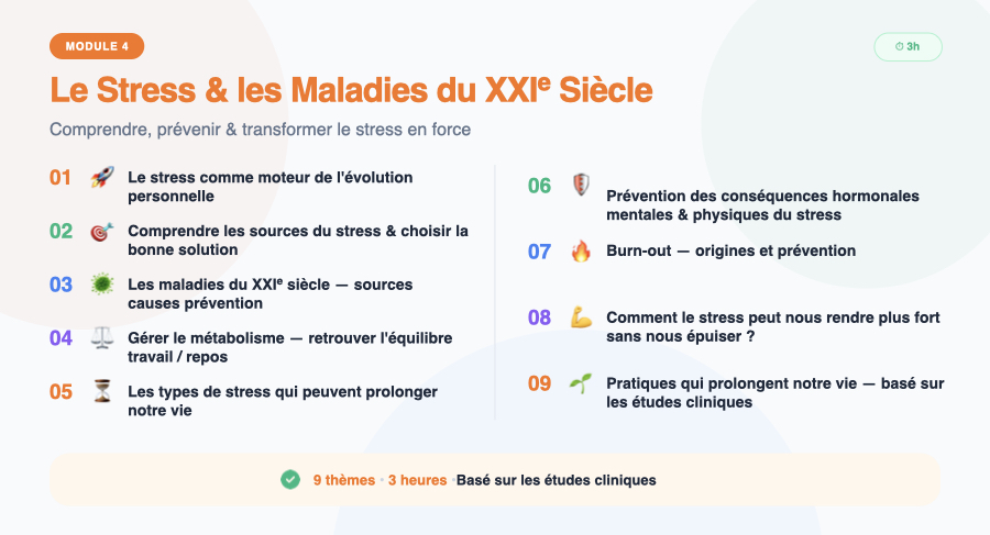 Ce module vous apprend à distinguer le bon du mauvais stress, à prévenir le burn‑out et à utiliser le stress comme un levier pour votre santé et votre longévité. »