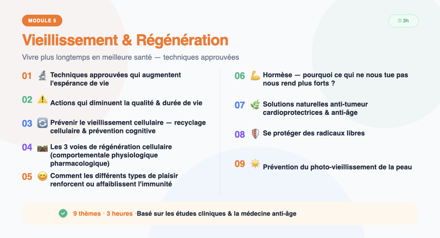 Ce module vous fait découvrir les techniques scientifiquement validées pour ralentir le vieillissement cellulaire, activer la régénération de votre corps et allonger votre espérance de vie en pleine vitalité. »